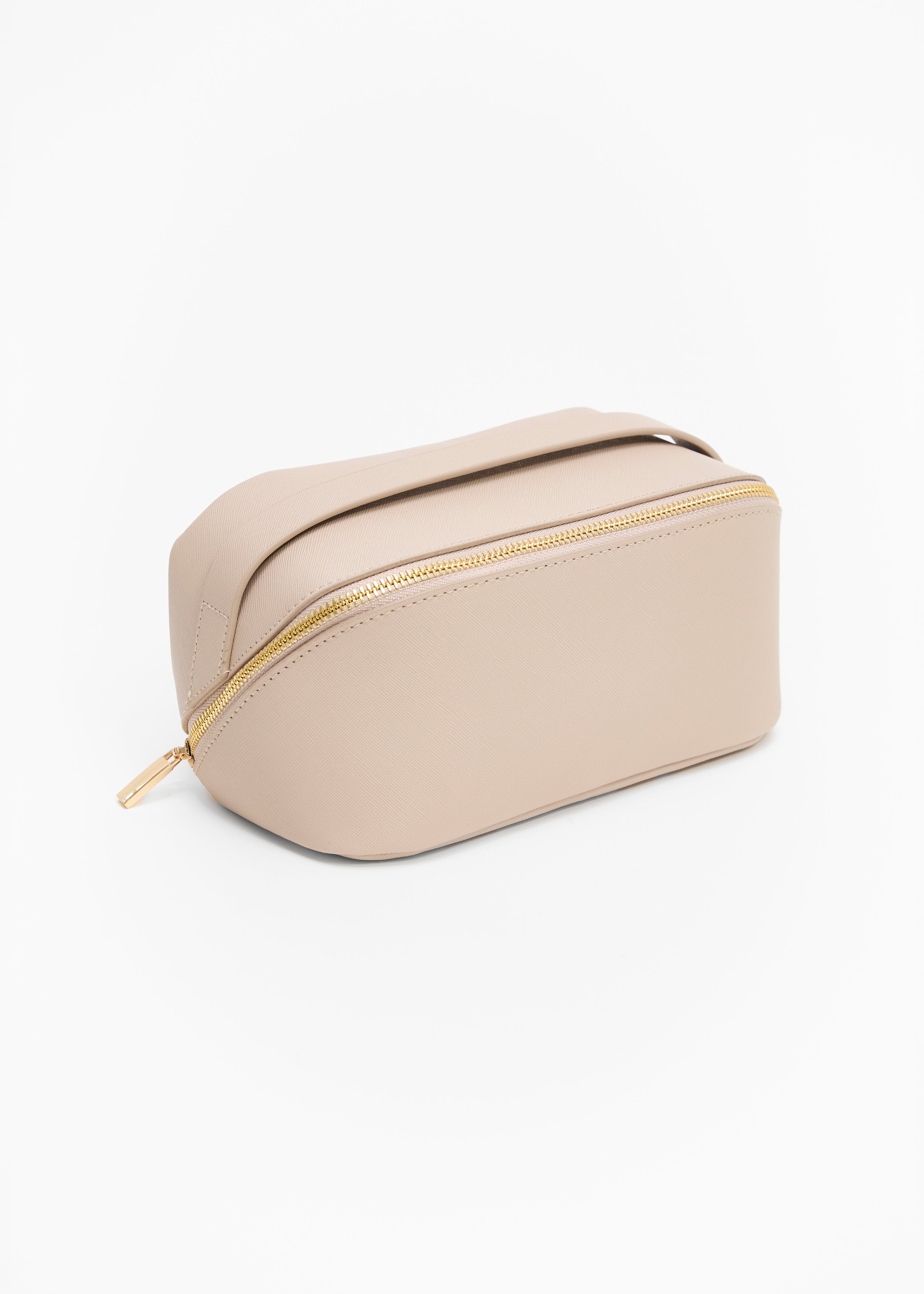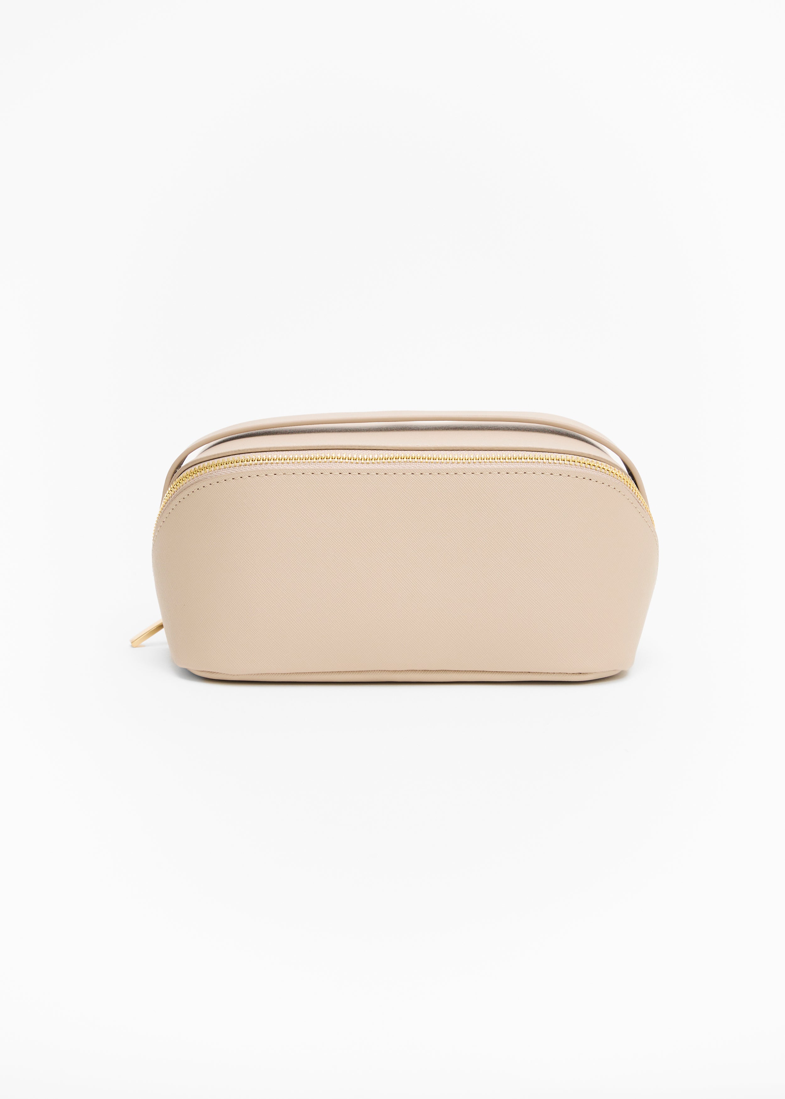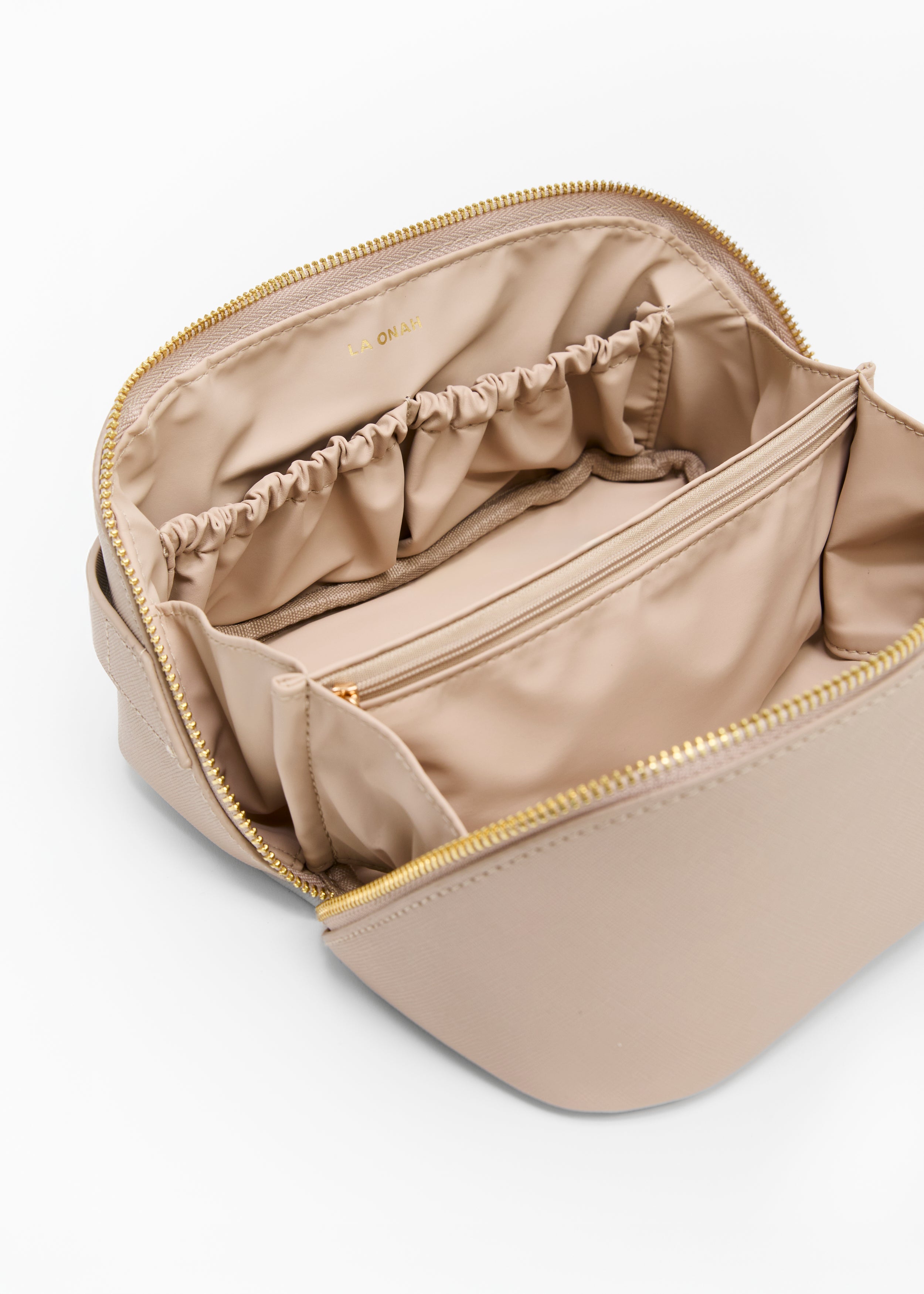 This is a spacious travel bag that embodies both responsibility and functionality, as it is made from cruelty-free vegan leather and waterproof lining. It is designed for makeup/skincare use, so we made sure that the lining of the bag is stain resistant, making it easy to clean and maintain once stained.