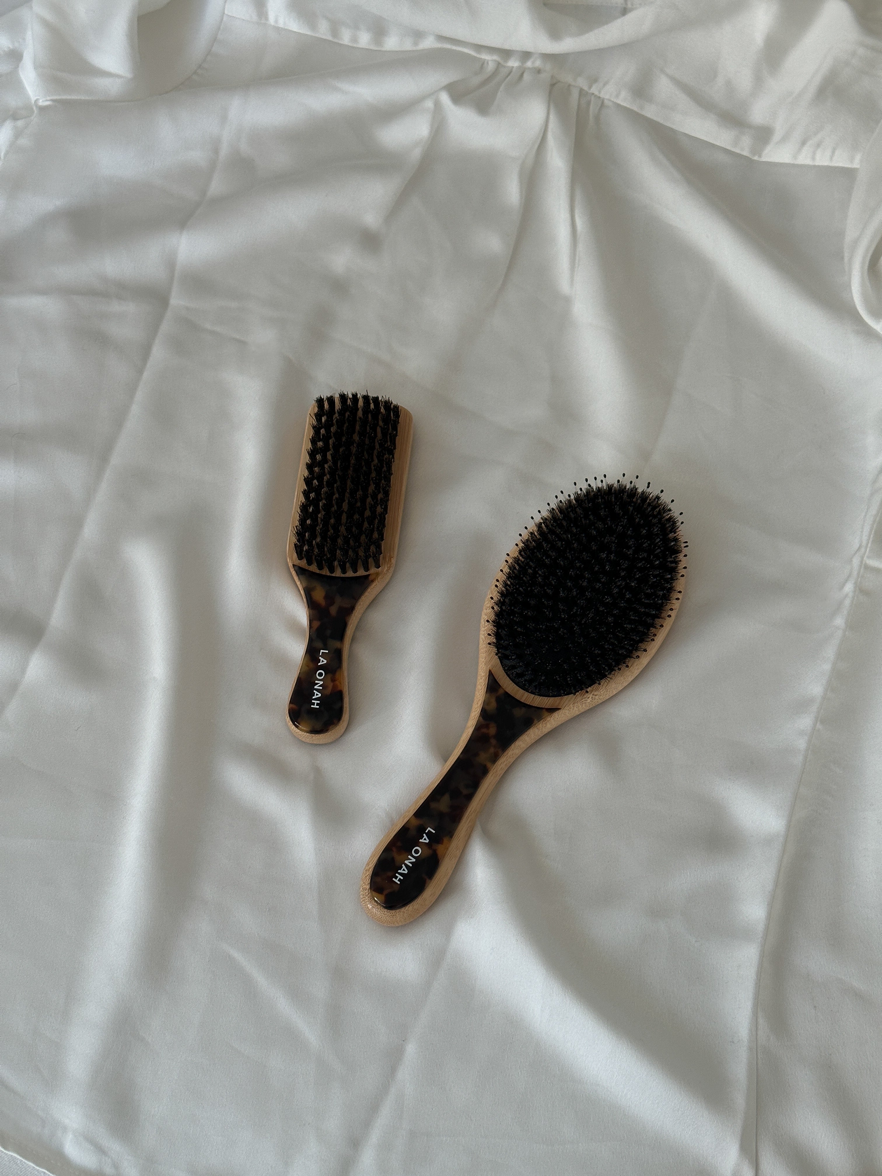 - Organic bamboo handle and natural boar bristles with cellulose acetate front and back